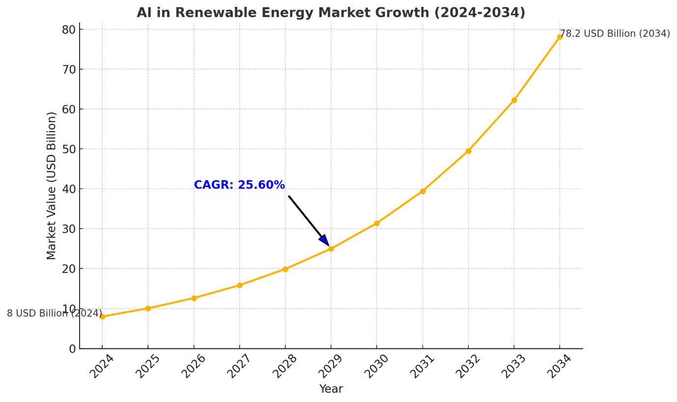 The global market for AI in Renewable Energy is set to witness unprecedented growth, projected to expand from 8 billion USD in 2024 to 78.2 billion USD by 2034, reflecting a staggering compound annual growth rate (CAGR) of 25.60%. This exponential rise underscores AI's increasing adoption as a critical tool in achieving energy efficiency, sustainability, and cost optimization.