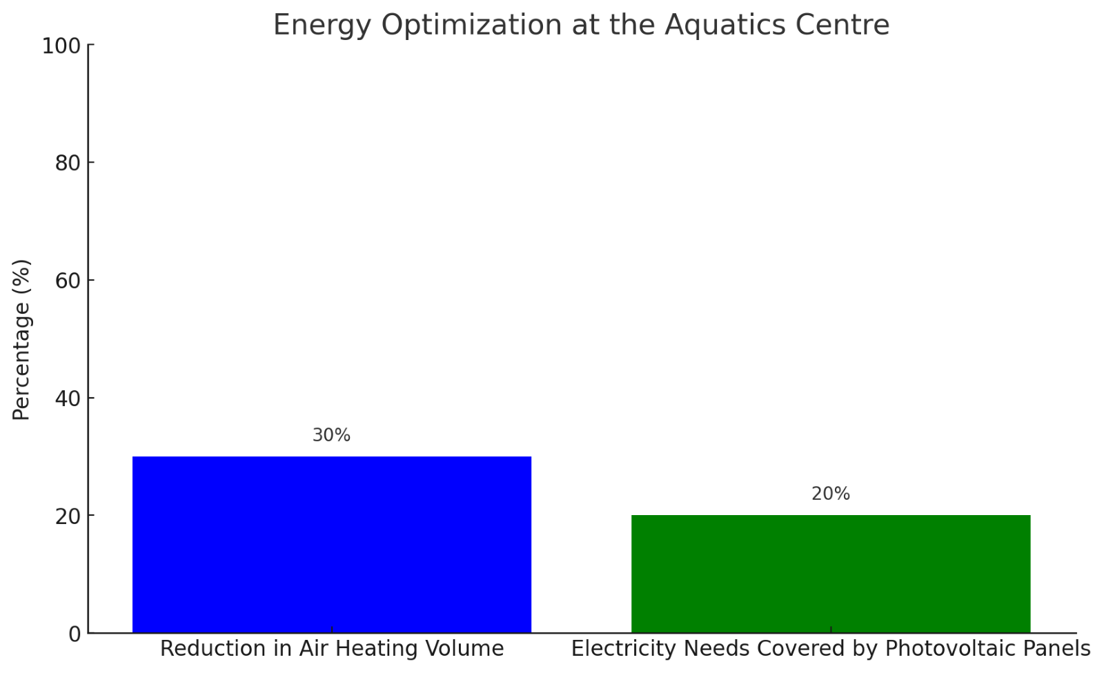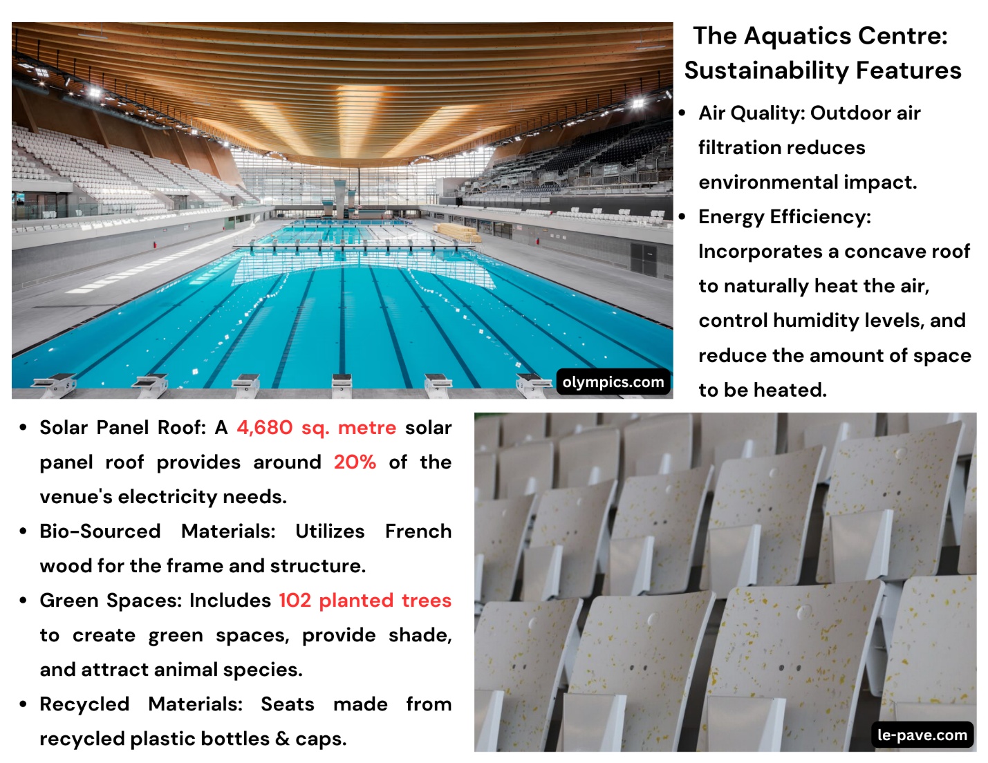 The Games operate entirely on 100% locally sourced renewable energy from France (Wind & Solar), transitioning seamlessly away from temporary diesel generators (Choosing renewable energy). Major venues like the Aquatics Centre and the Olympic Village are outfitted with solar panels, while geothermal cooling systems enhance their energy efficiency. The Athletes' village, set to become social housing post-Olympics, incorporates sustainable features such as natural cooling systems, despite the initial lack of built-in air conditioning. At the Aquatics Centre, the building is designed to optimize energy consumption for both the Games and future use. The concave roof shape reduces the volume of air needing heating by 30%, while pool water is maintained at 28°C using heat recovered from a neighboring data center. Additionally, photovoltaic panels on the roof will supply approximately 20% of the building’s electricity needs.