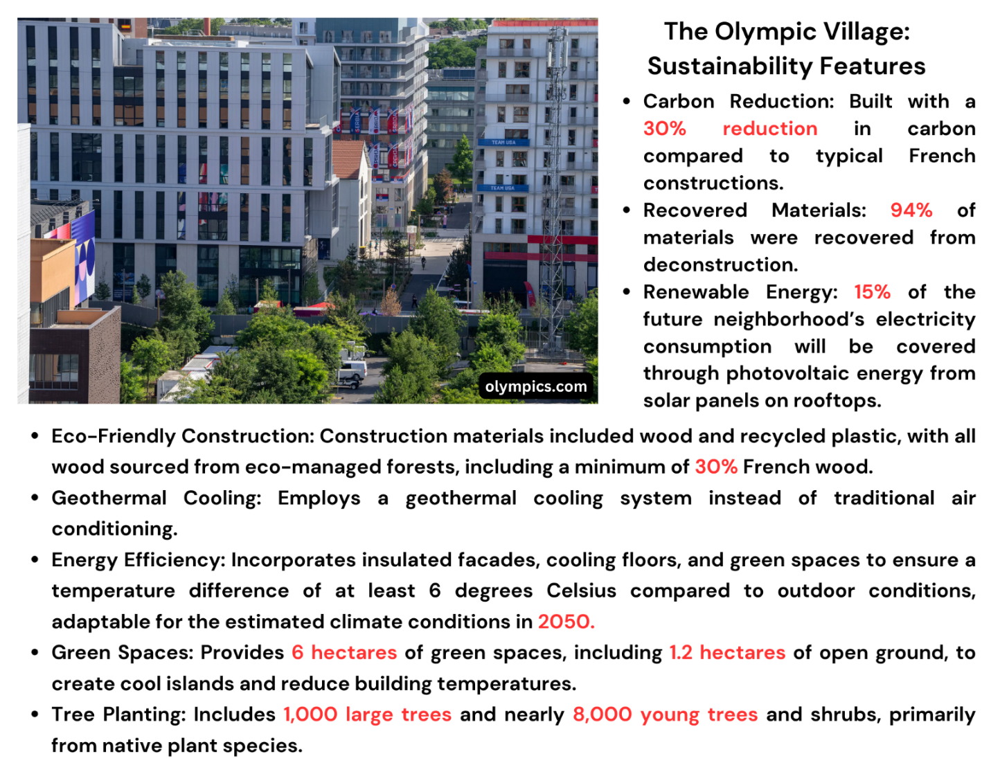 Public Transport: Enhancing the city’s public transport network, with 80% of the venues located within a 10 km radius of the Olympic Village (Will the Paris 2024 Olympics be the Greenest Ever?).