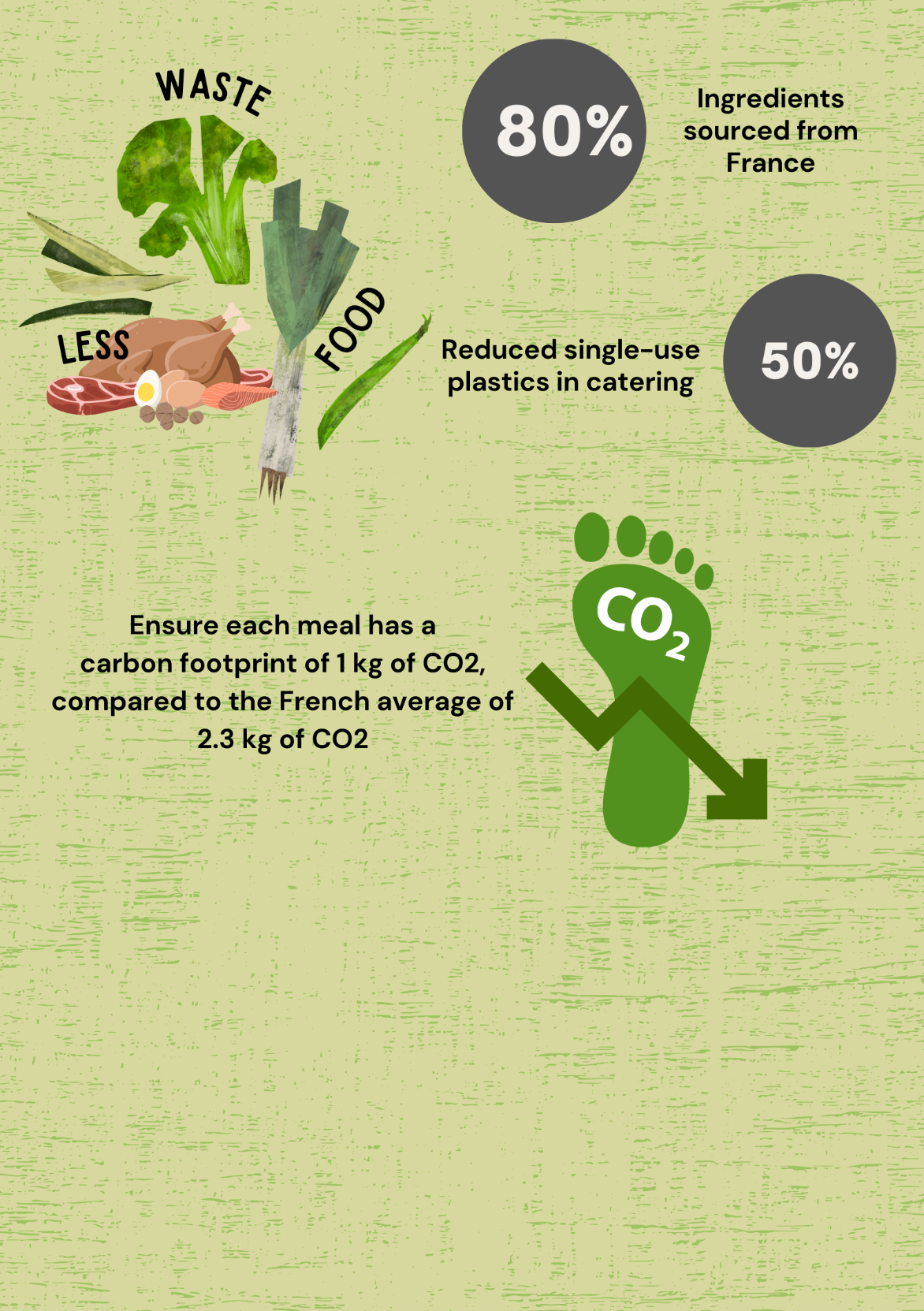 France is renowned for its rich, meat-centric cuisine, but Paris 2024 aims to reduce the carbon footprint of the 13 million meals expected to be served during the Olympic and Paralympic Games. The Food Vision initiative will double the amount of plant-based food compared to London 2012 and Rio 2016, with 80% of ingredients sourced from France, including all meat and dairy products. Efforts to limit food waste and reduce single-use plastics in catering by 50% aim to ensure each meal has a carbon footprint of 1 kg of CO2, compared to the French average of 2.3 kg (IOC). Despite these efforts, catering is anticipated to account for only 1% of the Games' overall carbon footprint, and concerns remain about food waste and Coca-Cola's use of single-use plastic bottles, raising accusations of greenwashing.