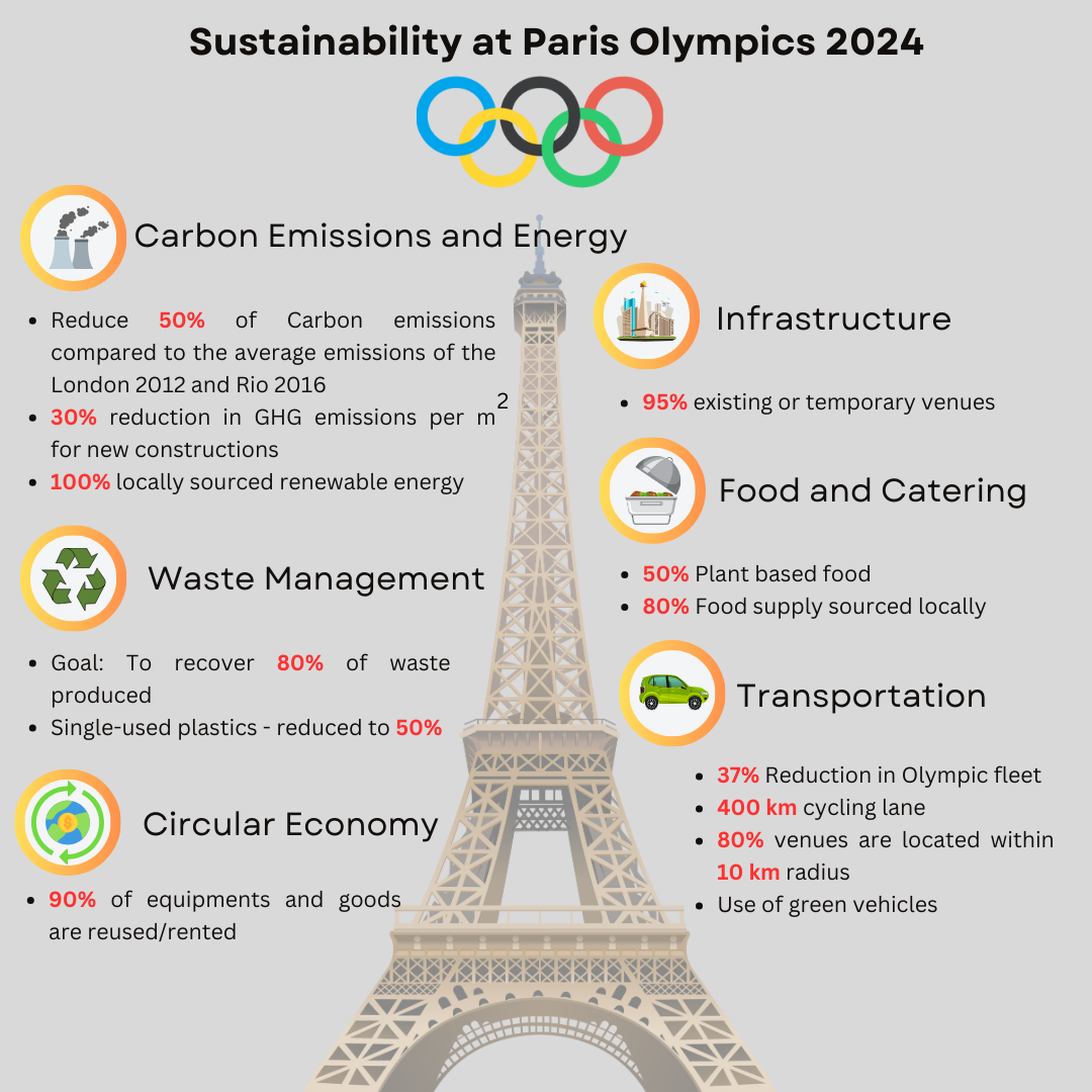 Paris, where the landmark Paris Agreement for net-zero emissions was adopted, is now setting a strong precedent for sustainability in the Olympics, marking a significant step forward in eco-friendly event management. The Paris 2024 Olympics symbolizes a transformative leap by integrating innovative infrastructure, strict environmental standards, and respect for local communities. Despite challenges, the commitment to minimizing the carbon footprint through various initiatives demonstrates a strong dedication to sustainability. Though not emissions-free, Paris 2024 sets a new standard, aligning with the Paris Agreement's goals and providing a blueprint for eco-friendly mega-events, guiding us toward a greener future.