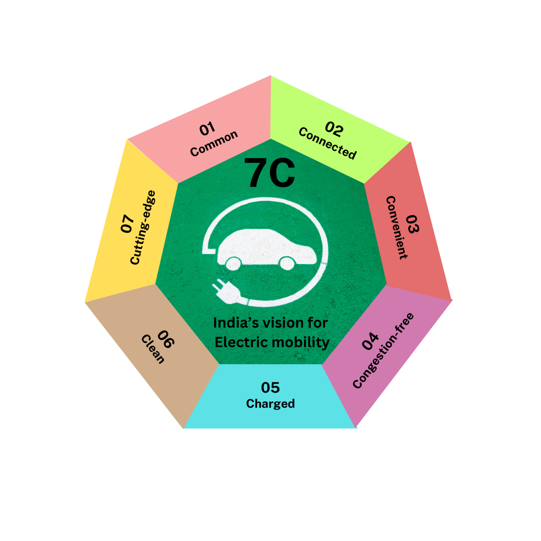 India's vision for future mobility is articulated around the seven principles known as the 7C's: Common, Connected, Convenient, Congestion-free, Charged, Clean, and Cutting-edge.